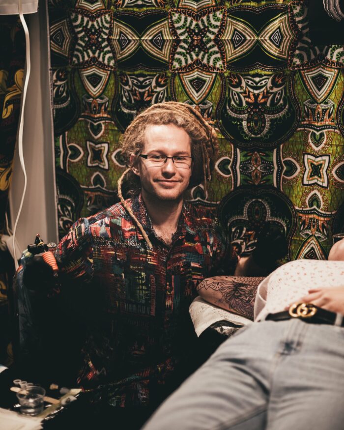 Projektuje i wykonuje głównie wieloetapowe i wielkopowierzchniowe kompozycje oparte na geometrii. Na co dzień prowadzi studio tatuażu Nice and Easy w centrum Warszawy.